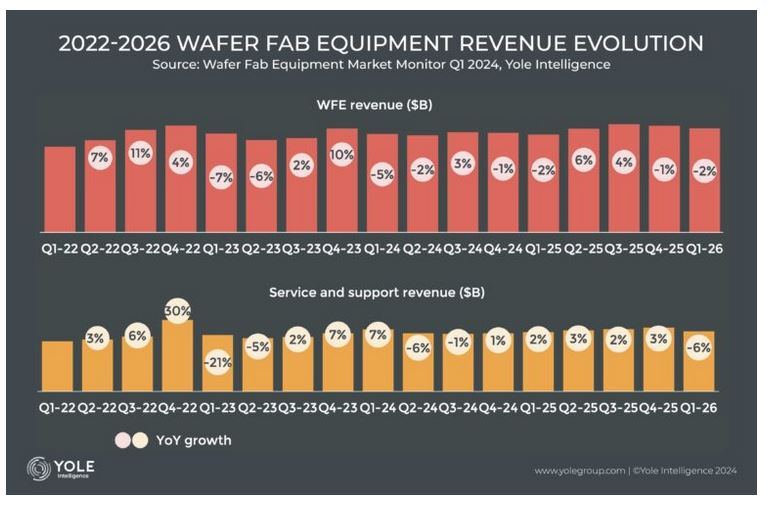 Once more, in CY2023, there was stagnation following the unprecedented revenue growth in wafer fab equipment (WFE) witnessed in CY2022. 2024 is also expected to be flat in terms of absolute value and market shares.